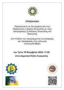 Προσκαλείστε σε δεντροφύτευση που διοργανώνει ο Δήμος Λευκωσίας με τους Δικηγορικούς Συλλόγους Λευκωσίας και Κερύνειας στο πλαίσιο του προγράμματος συνεισφοράς και προσφοράς στην κοινωνία «Λευκωσία Μαζί», την Τρίτη, 19 Νοεμβρίου 2024, στις 11:00 π.μ., στον Δημοτικό Κήπο Λευκωσίας.